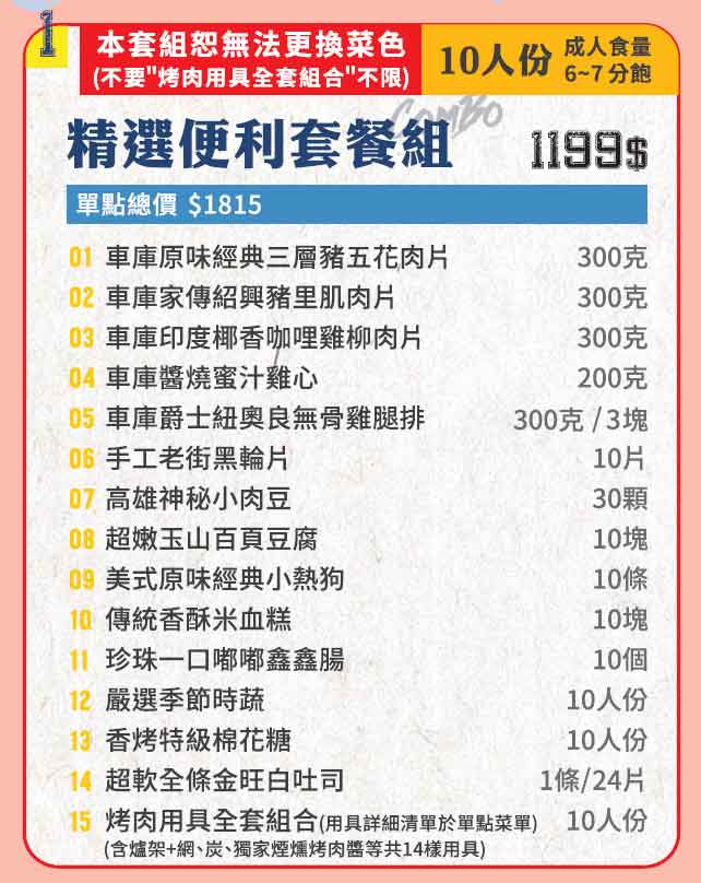 15.烤肉用具全套組合(含爐架+網、炭、獨家煙燻烤肉醬等共14樣用具) /10人份