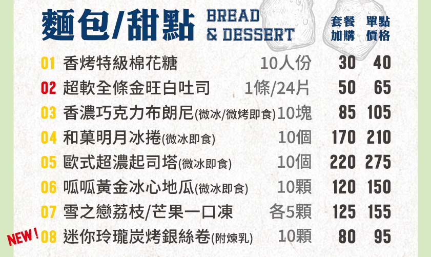 單點麵包/甜點1.香烤特級棉花糖 /10人份2.超軟全條金旺白吐司 1條/24片3.香濃巧克力布朗尼(微冰/微烤即食) /10塊4.和菓明月冰捲(微冰即食) /10個5.歐式超濃起司塔(微冰即食) /10個6.呱呱黃金冰心地瓜(微冰即食) /10顆7.雪之戀荔枝/芒果一口凍 /各5顆8.迷你玲瓏炭烤銀絲卷(附煉乳) /10顆