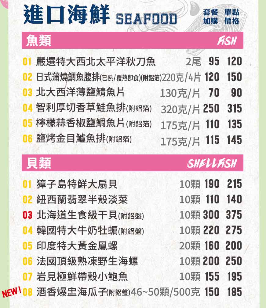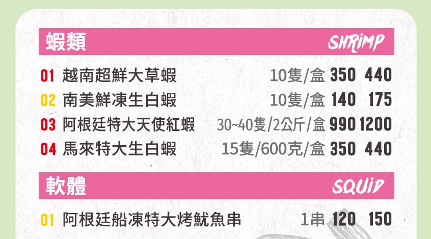 單點進口海鮮Table of Contents Toggle魚類貝類蝦類軟體魚類1.嚴選特大西北太平洋秋刀魚 /2尾2.日式蒲燒鯛魚腹排(已熟/覆熱即食)(附鋁盤) 220克/4片3.北大西洋薄鹽鯖魚片 130克/片4.智利厚切香草烤鮭魚片(附鋁箔) 320克/片5.檸檬蒜香椒鹽鯛魚片(附鋁箔) 175克/片6.鹽烤金目鱸魚片(附鋁箔) 175克/片貝類1.獐子島特鮮大扇貝 /10顆2.紐西蘭翡翠半殼淡菜 /10顆3.北海道生食級干貝(附鋁盤)/10顆(無法選換)4.韓國特大牛奶牡蠣(附鋁盤) /10顆7.岩見極鮮帶殼小鮑魚 /10顆5.印度特大黃金鳳螺 /20顆8.酒香爆盅海瓜子(附鋁盤) 46~50顆/500克6.法國頂級熟凍野生海螺 /10顆蝦類1.越南超鮮大草蝦 10隻/盒(無法選換)2.南美鮮凍生白蝦 10隻/盒3.阿根廷特大天使大紅蝦 30~40隻/2公斤/盒(無法選換)4.泰國特大生白蝦 15尾/600克/盒(無法選換)軟體1.阿根廷船凍特大烤魷魚串 /1串